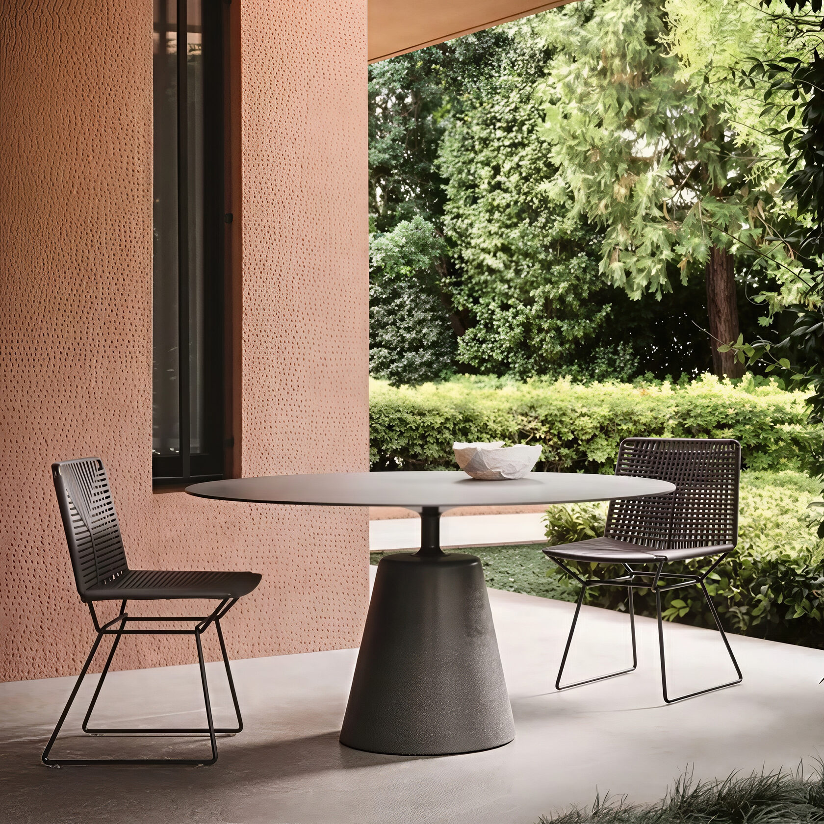 Дополняет коллекцию комплект для обеденной зоны от дизайнера Жана Мари Массо, в который входят стол Rock и кресла Flow Filo. Стол характеризуется тонкой столешницей, создающей ощущение легкости, и устойчивым основанием. Уникальный силуэт кресел, по словам представителей, подчеркивает изысканность всей серии, формируя гармоничный ансамбль для оформления садов, патио и открытых веранд.