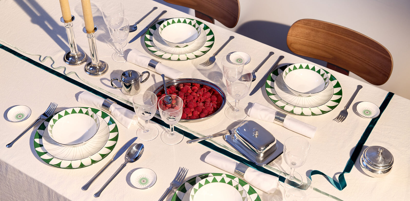 Художница Наталья Вельш предлагает погрузиться в гипнотическую красоту узоров, вдохновлённых калейдоскопом. В сервизе зеркальная геометрия и глубокий зелёный цвет, напоминающий оттенок старинного стекла, создают эффект драгоценности. Динамическая природа калейдоскопа здесь застыла, позволяя рассмотреть каждый симметричный фрагмент. Как и в жизни, где наш путь постоянно меняется, из отдельных тарелок можно собрать целостный гармоничный образ.