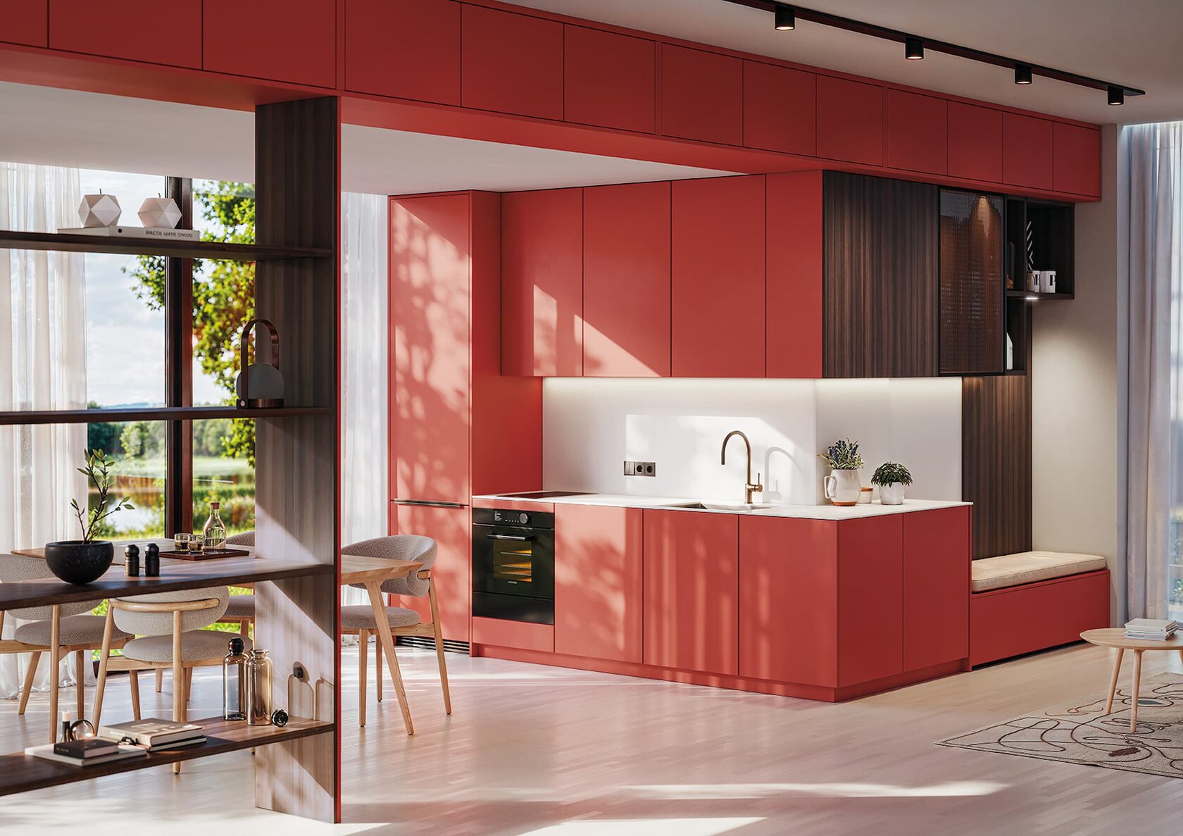 Особое место в коллекции занимают поверхности из орехового дерева. Их дизайн с большими извилистыми линиями сочетает традиционную и современную эстетику, а карамельный оттенок добавляет яркости.