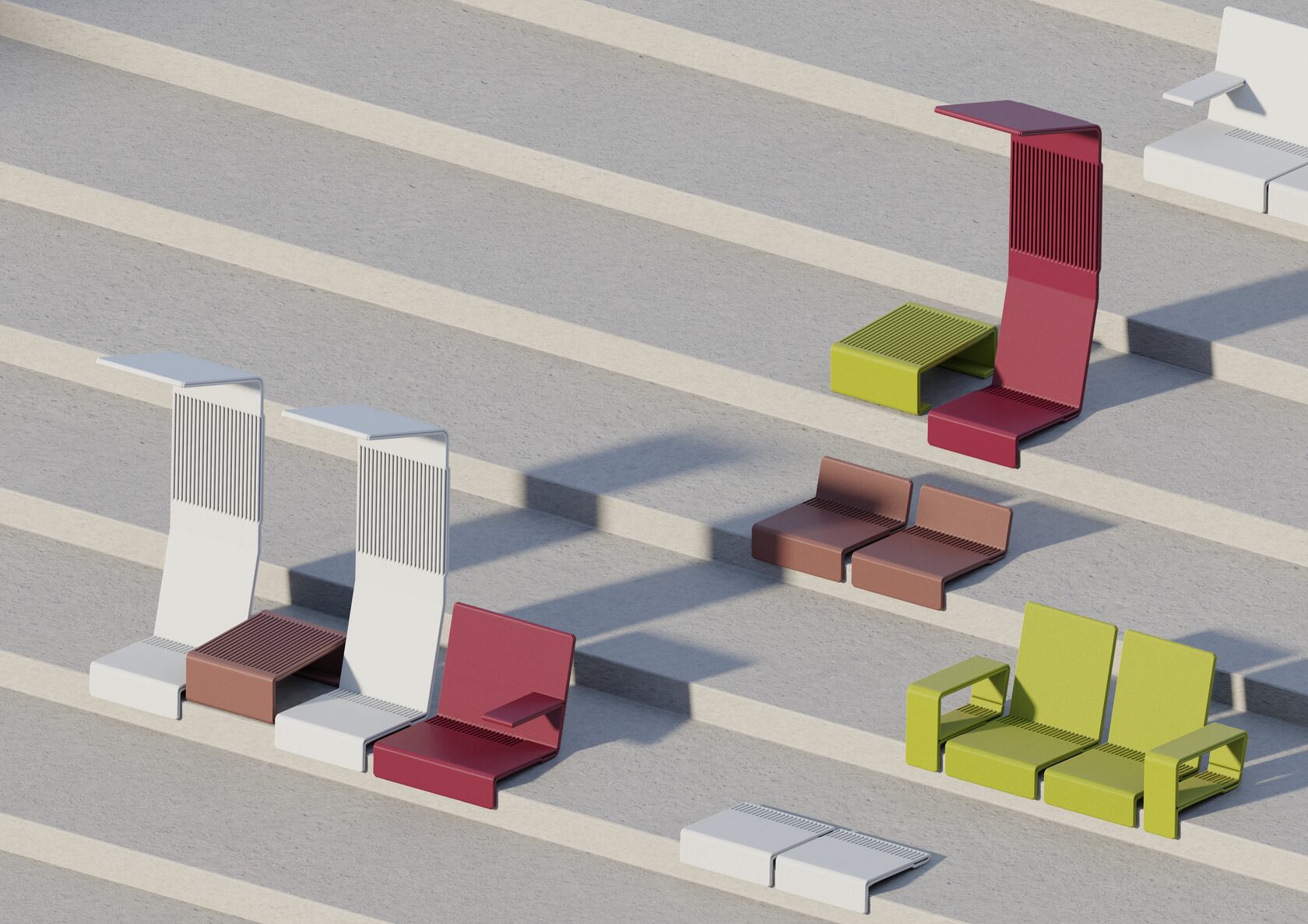 Основной материал — переработанный пластик, что позволяет создавать изделия с замкнутым жизненным циклом. По истечении срока службы, который оценивается в 7–8 лет, мебель можно переработать и использовать для производства новых объектов.