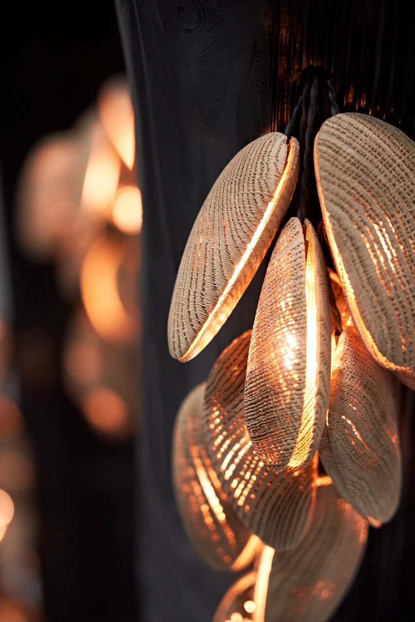 В объекте Wood&See дизайнеры обращаются к образу деревянных свай пирса, обросших ракушками. Но главное здесь — технология. Структура «ракушек» прорезается до контура волокон, создавая кружевной узор. Свет проходит сквозь эти микроотверстия, и дерево начинает светиться изнутри. Это принципиально иное качество, чем просто освещение: свет рождается из материала, а не падает на него.