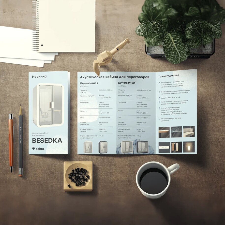 Серия акустических кабинок BESEDKA гармонично вписалась в коллекцию акустических решений dobro, в которую уже входили акустические перегородки и кабинки-диваны. Акустические кабинки от dobro созданы для работы в офисе, звонков и переговоров — они вместительные, полны свежего воздуха и по-настоящему тихие.
